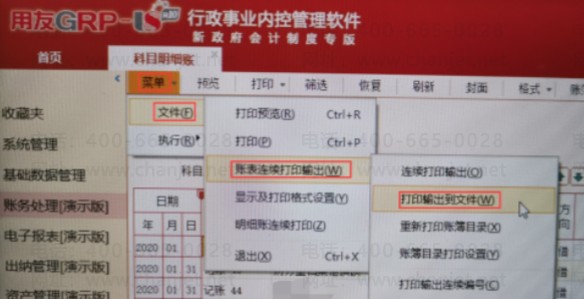 2、点击左上角菜单-文件-账表连续打印输出-打印输出到文件