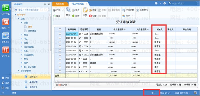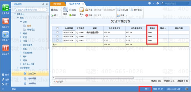 2、 操作员“李三”登录u8,打开总账-凭证-填制凭证界面,查看不到“账套主管001”做的凭证,可以查看到有分配了查询权限的“demo”用户的凭证