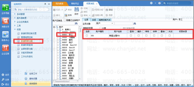 数据权限控制设置里,勾选了用户,需要和数据权限里的用户权限一起进行控制,希望操作员没有分配对某用户查询权限,不能查询到此用户的凭证,但现在操作员“李三”没有分配对用户“账套主管001”的查询权限,还是可以查询到“账套主管001”填制的凭证。