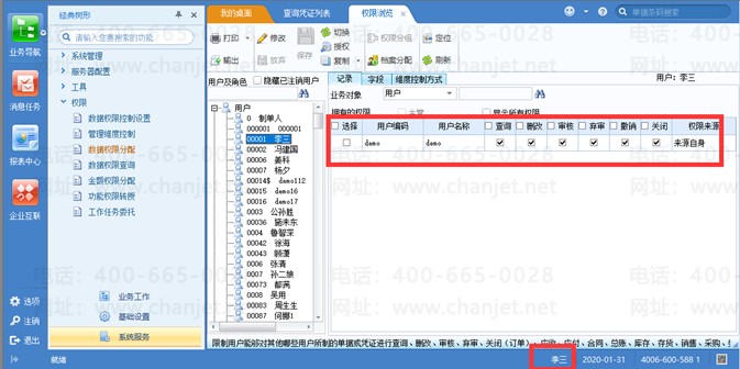 2、 当数据权限控制设置里勾选了用户时,必须勾选“可查询他人凭证”对应的“控制到操作员”才可以按用户权限控制能否查看他人的凭证