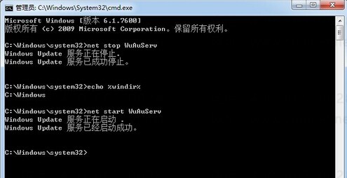 1、在win7系统下用快捷键(WIN+R)在“运行”中输入“CMD”确定,然后在cmd命令行里面输入 net stop WuAuServ回车,继续输入 echo %windir%回车。