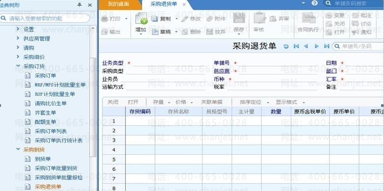 『业务工作』—『供应链』—『采购管理』—『采购到货』—『采购退货单』