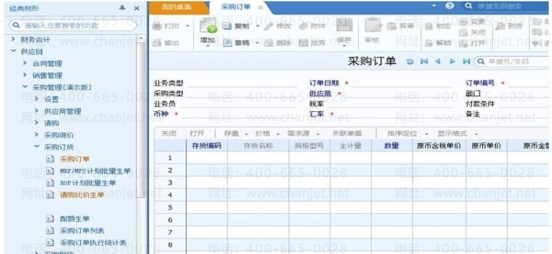 操作说明:点击增加录入订单日期、采购类型、供应商 请购部门以及税率 币种 汇率等信息 然后在表体录入采购的货物 数量及单价金额点保存。