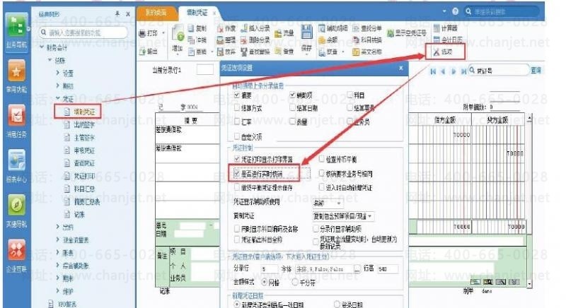 进入总账系统,【填制凭证】界面的【选项】中勾选“是否进行实时核销”