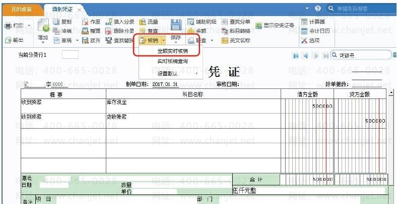 3、录入完贷方分录后,自动跳转“实时核销”界面或点击【填制凭证】界面【核销】-【全额实时核销】,进行实时核销。