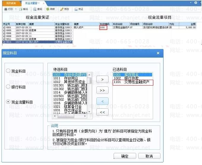 查看现金流量凭证有1101科目记录,需要将凭证上的流量删除(选项未勾选现金流量必录流量可以删除),会计科目指定科目将1101从已选挪到待选科目保存。