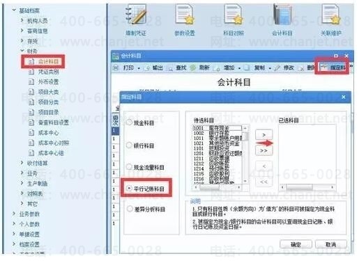 在基础设置-基础档案-财务-会计科目,工具栏的指定科目。(识别需要平行记账的科目)