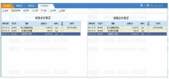 财务会计-总账-凭证-填制凭证,平行记账默认是单凭证模式,既预算凭证和财务会计凭证是在一张凭证上的。在点击增加凭证后录入财务会计凭证,点击工具栏的平行记账按钮,会在同一张凭证下自动带出预算会计凭证分录,如已经做了科目对照会直接带出科目,未做科目对照的需要手工录入科目。