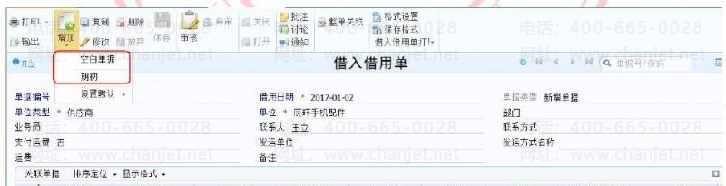1.录入借入借用单,同样支持新增空白单据和期初单据.单位类型支持供应商和客户.