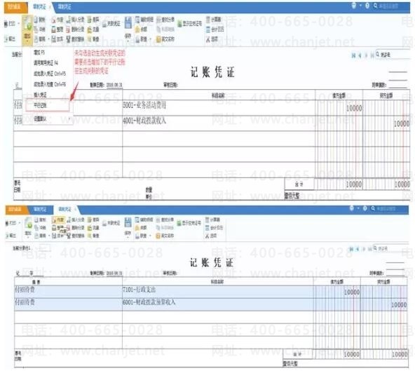 与日常填制凭证一样,进入填制凭证界面,如为平行记账规则的凭证,通过平行记账功能+指定科目+科目对照设置,来实现填制财务分录自动生成对应预算分录的双分录或双凭证的核算模式。在具体操作过程中,单凭证和双凭证模式状态,略有差异,主要为: