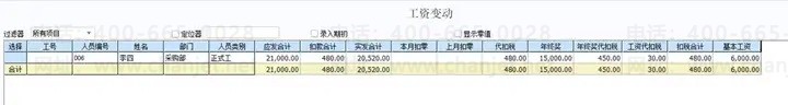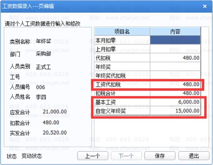 例:一月份公司给李四发放基本工资6000、年终奖15000,年终奖使用并入综合所得的方式计税,在工资项目【基本工资】上录入6000,在【自定义年终奖】上录入15000,得到工资代扣税为480。