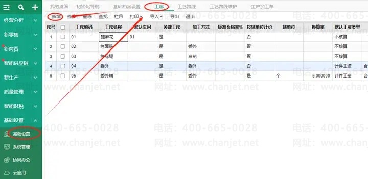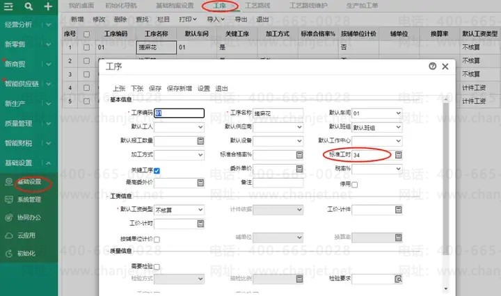 1、工序档案中录入标准工时数据:基础设置-工序-新增