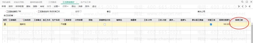 工艺路线内选择之前维护好的工序,可以看到【标准工时】字段为空值