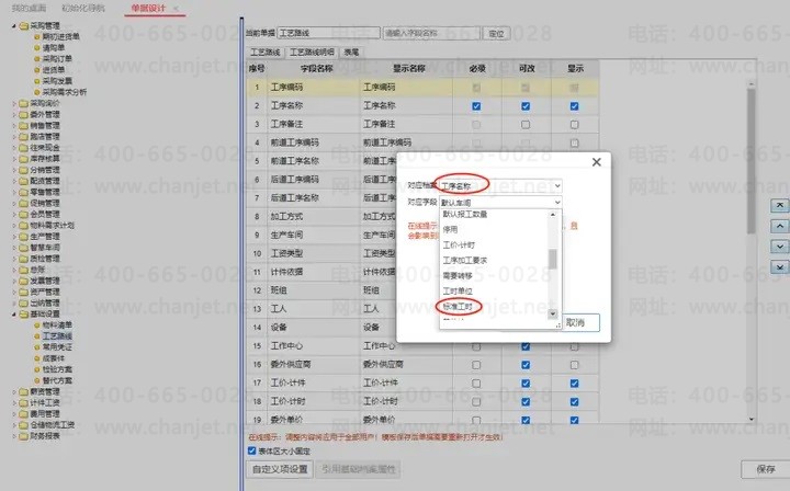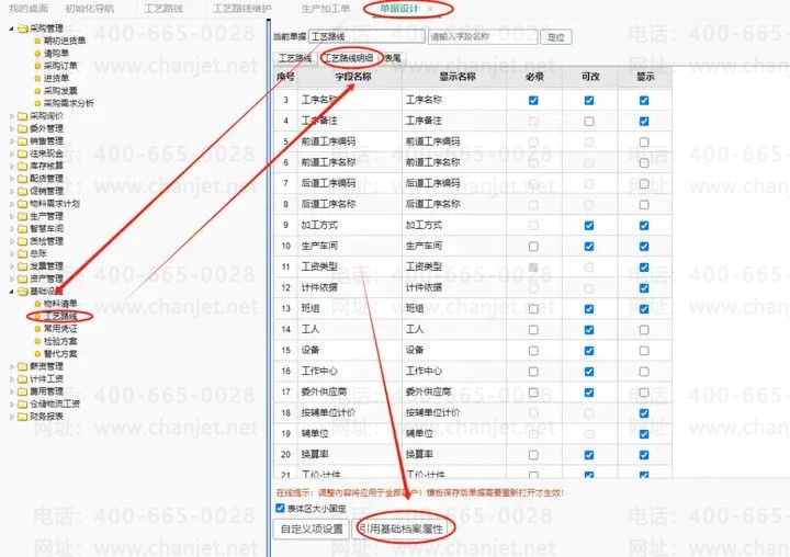 3、系统管理-单据设计-工艺路线-工艺路线明细,引用基础档案属性。