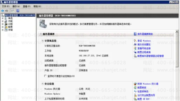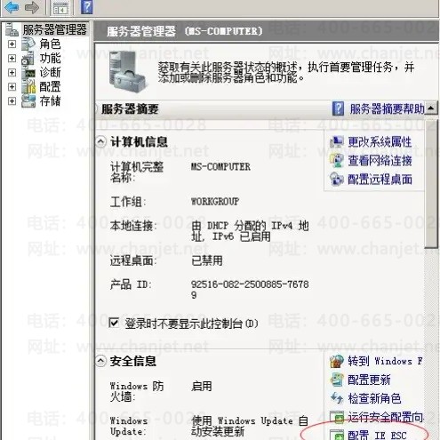 4、直接设置法 对于较高级的版本如Windows2008等,则提供了更为方便的设置方法。只需在“控制面板”-“管理工具”-“服务器管理器”的启动界面中将“安全信息”-“配置IE SEC”中进行“关闭”即可。