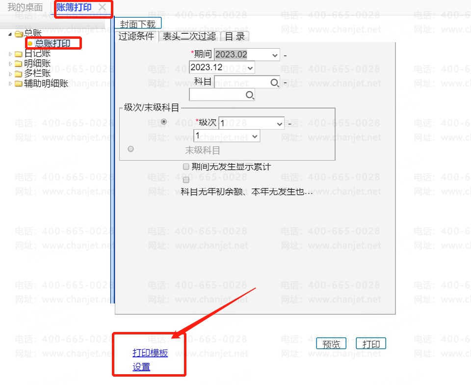 打开【账簿打印】选择【科目总账】,点击【打印模板设置】