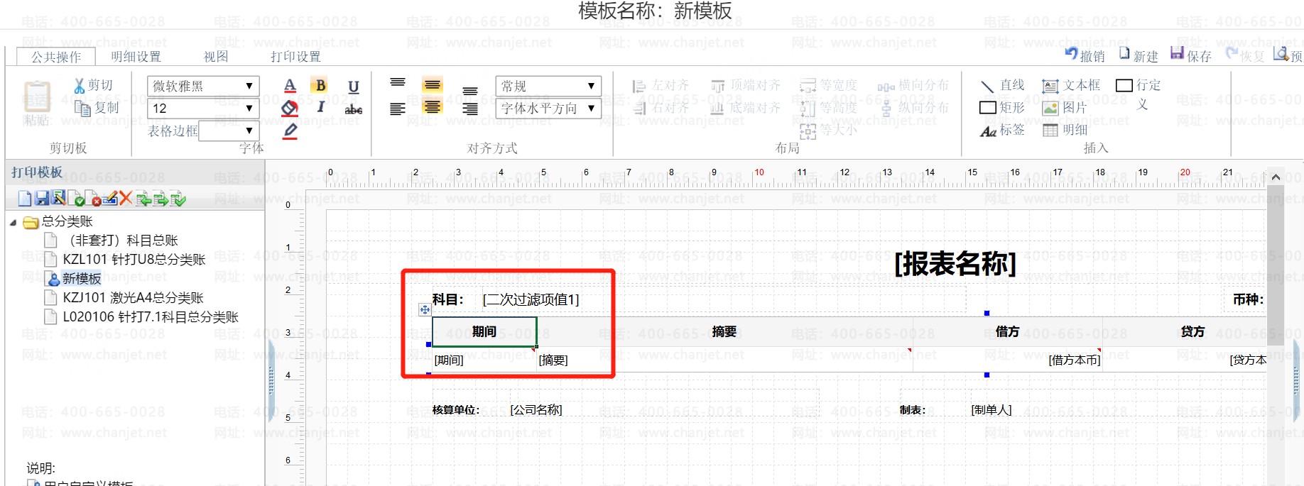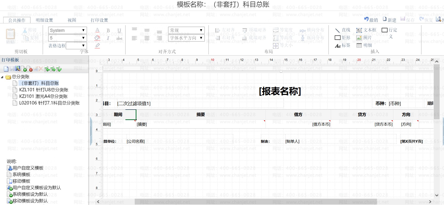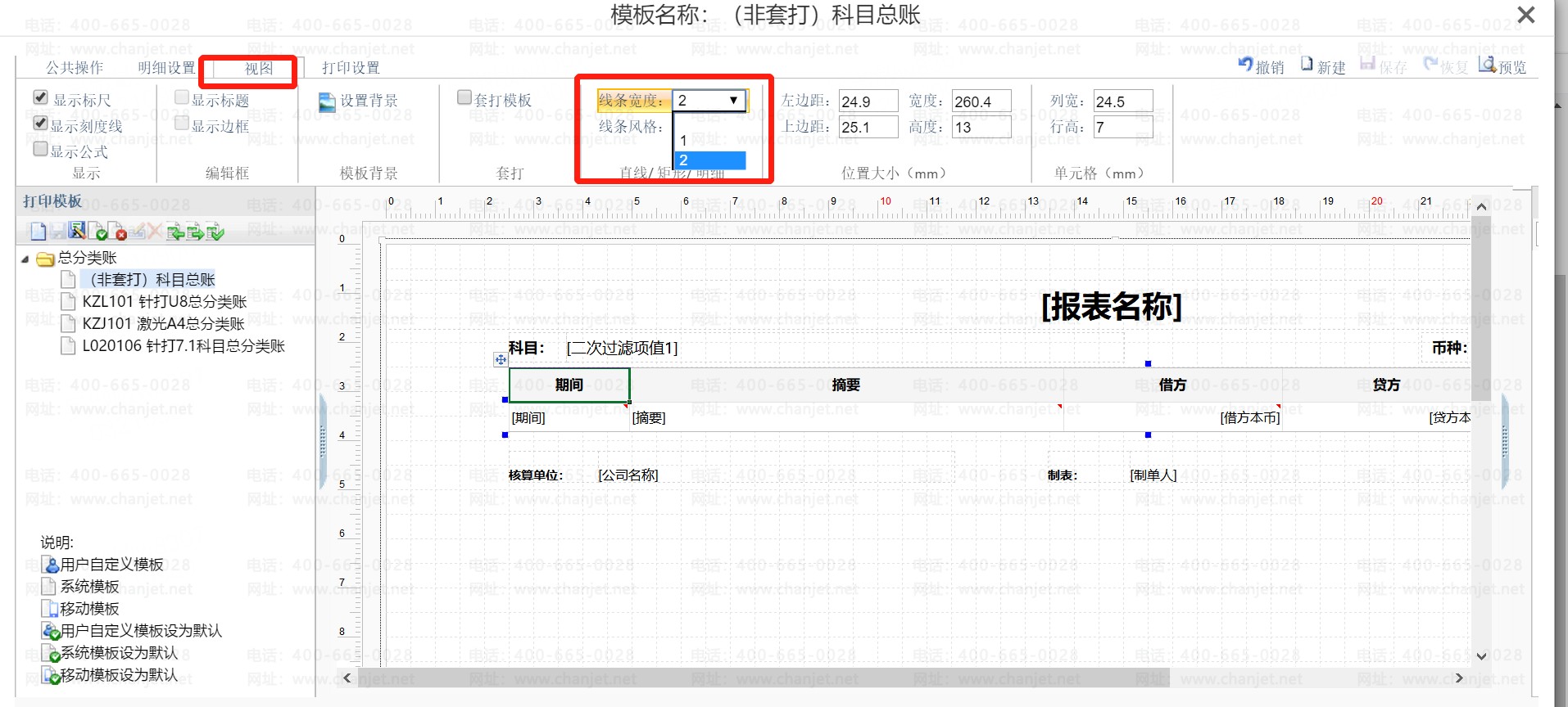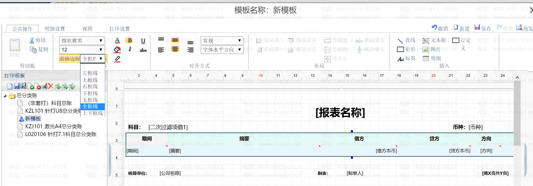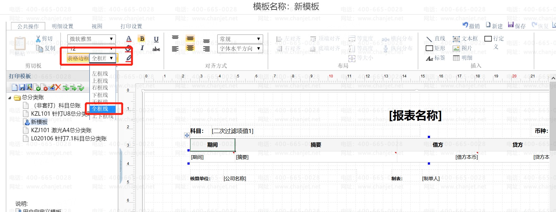 用户使用系统预置模板打印科目总账,模板内表格边框打印出来显示不清晰,有什么方式可以加深表格边框呢?
