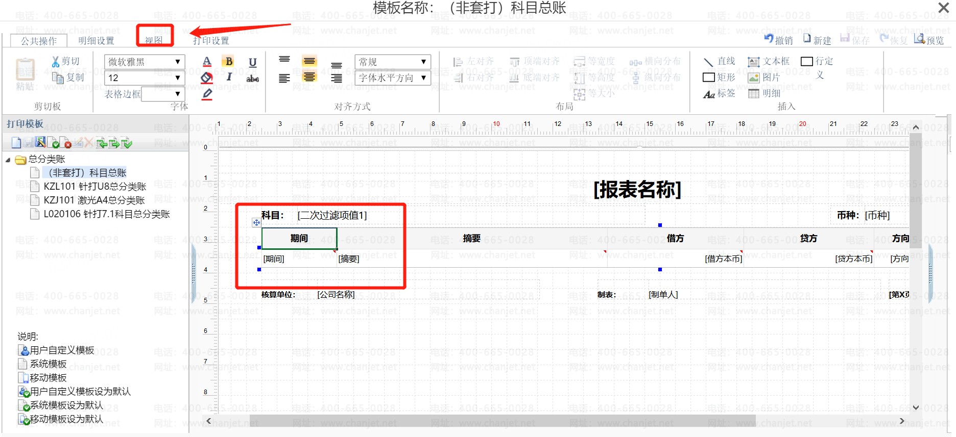 1、打开模板之后选择报表内任意单元格,点击【视图】