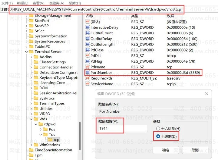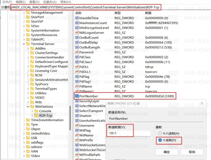 注意,点开的时候,基数那里要选择十进制,把3389修改成自己希望的端口,如1911。