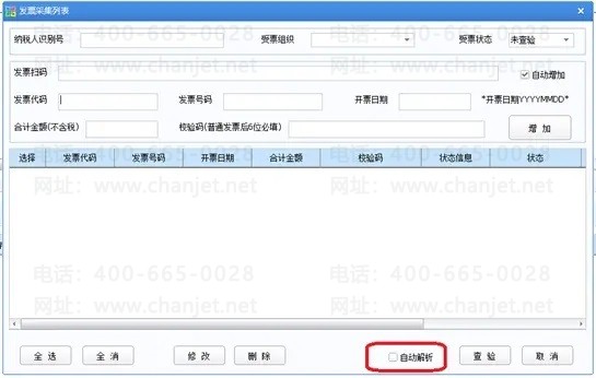 根据选项-是否自动解析,如果勾选该选项,则调用查验接口获取到的税票,在关闭查验界面带入列表时会自动将存货、供应商信息根据发票管理的解析规则进行解析。
