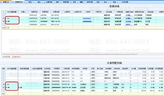 如果勾选的税票没有订单号——根据业务类型+供应商编码+存货编码定位发票记录,并按订单排列顺序将税票数量分摊给订单直到分摊完,匹配到的订单记录显示已匹配数量,用户可以对匹配结果手工调整分配数量。