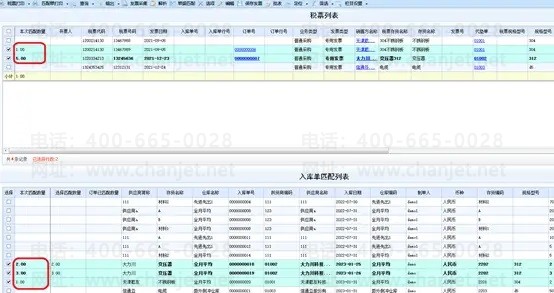 如果发票列表上勾选的税票有订单号+入库单号——按入库号+存货编码+供应商编码+业务类型匹配列表中的入库单。匹配成功显示已匹配数量