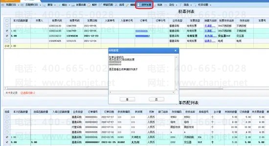 对于匹配成功的发票记录,点【保存发票】按钮,根据匹配的结果自动生成采购管理系统的发票。发票上会自动记录税票号码、税票代码,同时发票号信息会回写到三单匹配的发票号字段。