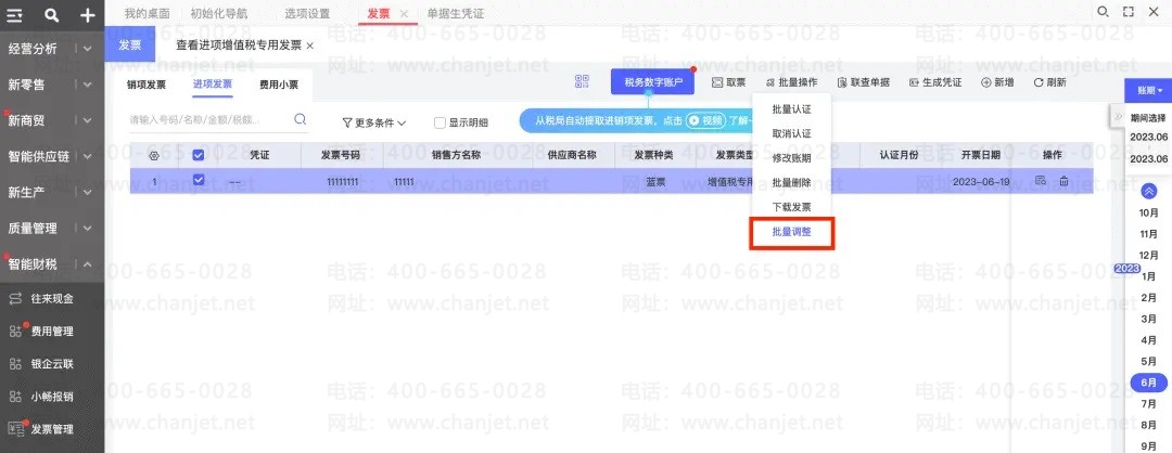 在发票列表界面,选择发票,点击批量操作-批量调整-供应商,手工匹配往来单位档案;