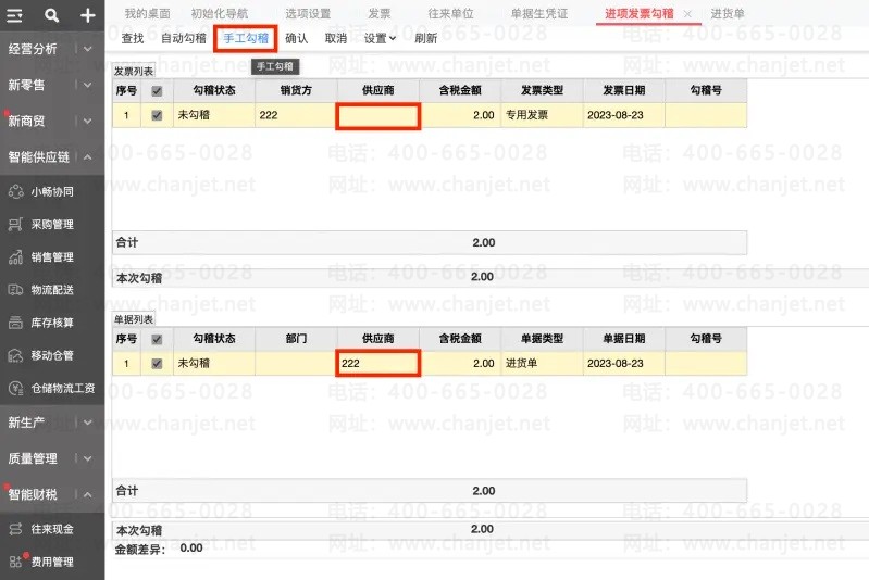 在进项发票勾稽界面,选择供应商为空的发票,与单据做手工勾稽,手工匹配往来单位档案;