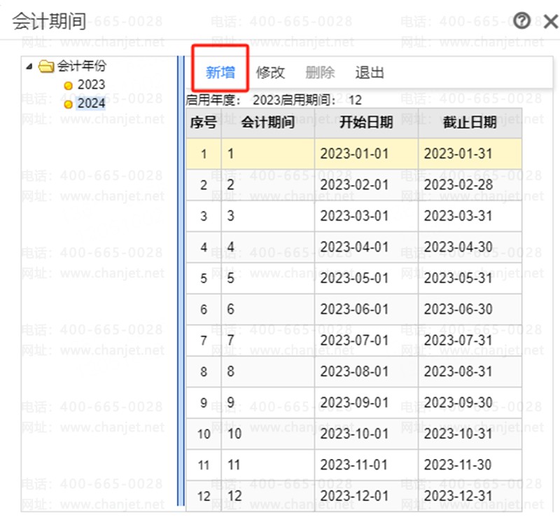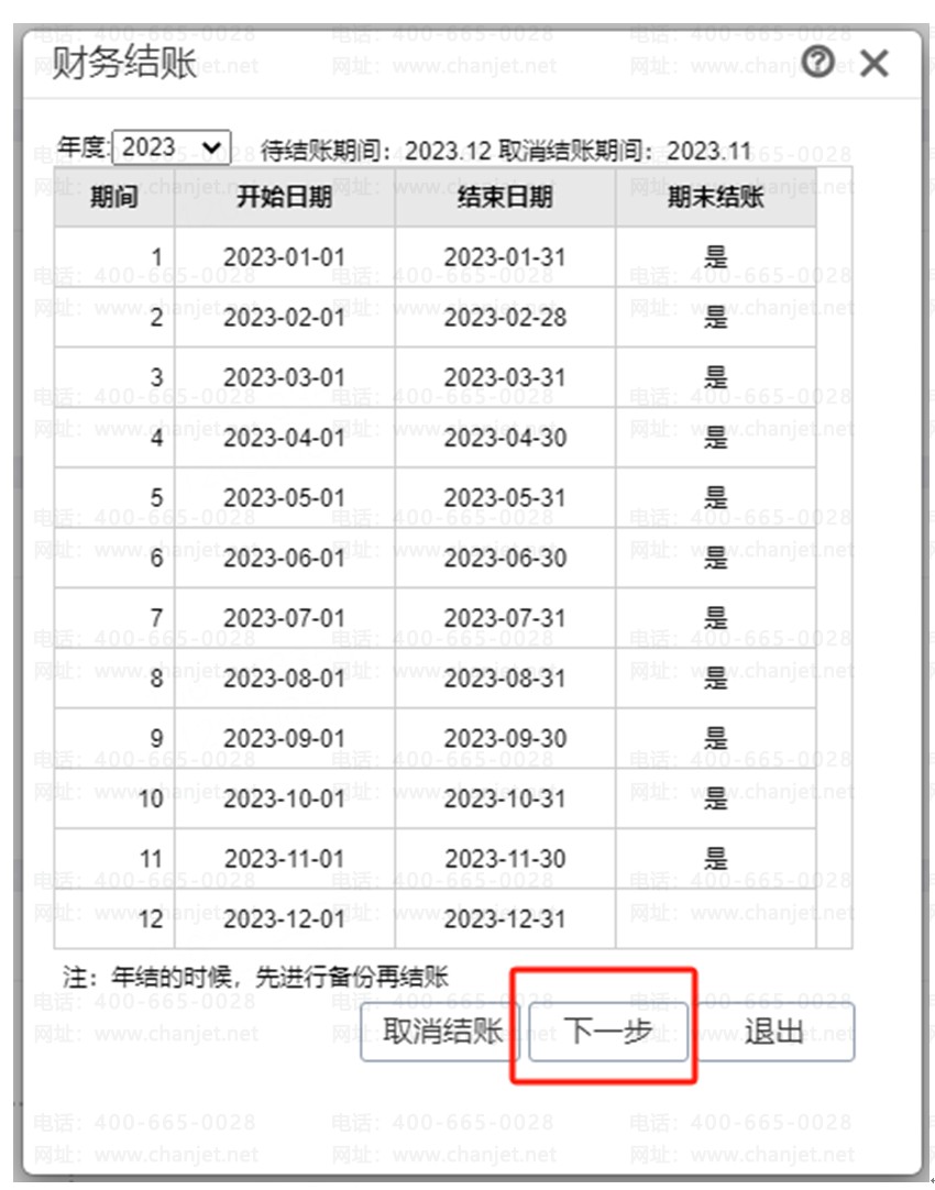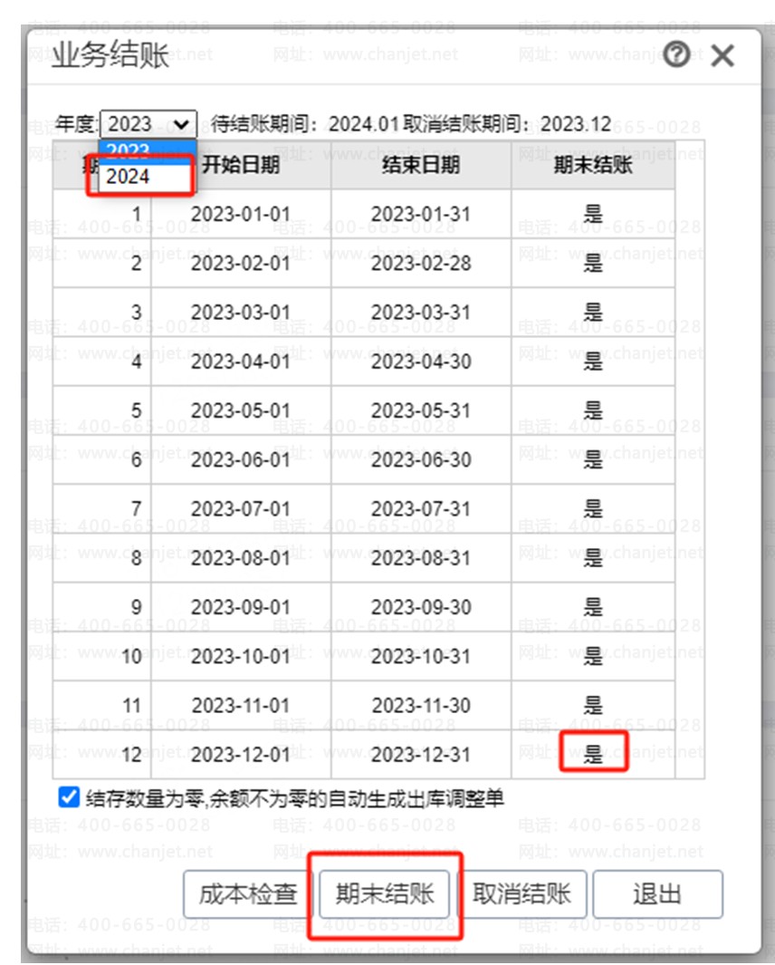 (1)2023 年 12 月业务模块结账,【系统管理】—【基本设置】—【业务结账】,当业务 12月结完账时,会自动生成 2024 年的会计期间。