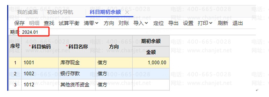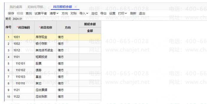 (3)返回到登录界面,使用新年度2024 年的日期登入到软件中,依次点击【初始化】—【科目期初】,此时科目期初为上年度的期未余额。