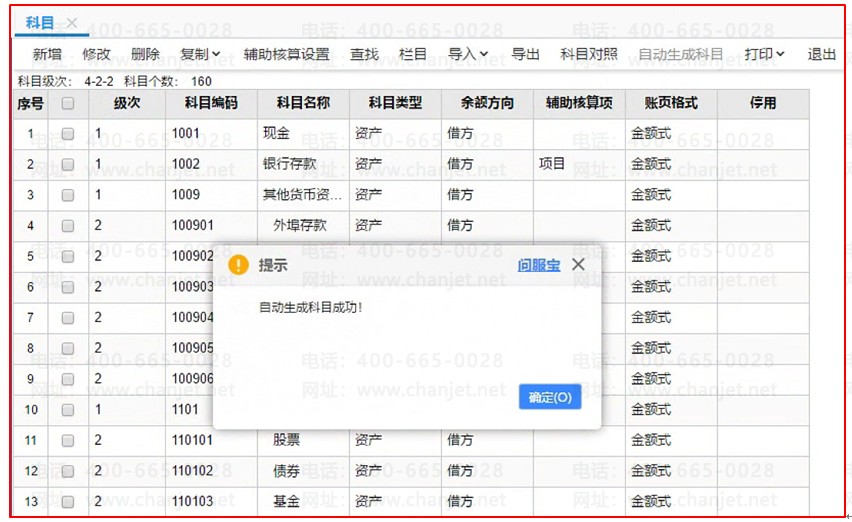 (4)最终显示提示框【自动生成科目成功!】,如下图所示: