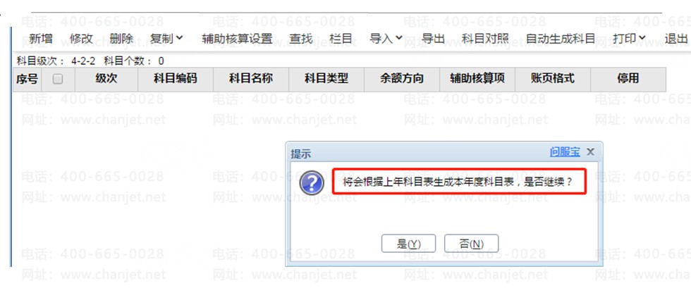 (3)弹出对话框提示:【将会根据上年科目表生成本年度科目表,是否继续?】,点【是】即可, 如下图所示: