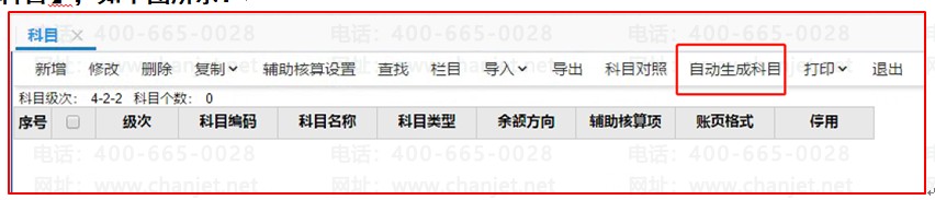 (2)以新年度的会计日期登入软件,【基础设置】—【财务信息设置】—【科目】—【自动生成科目】,如下图所示: