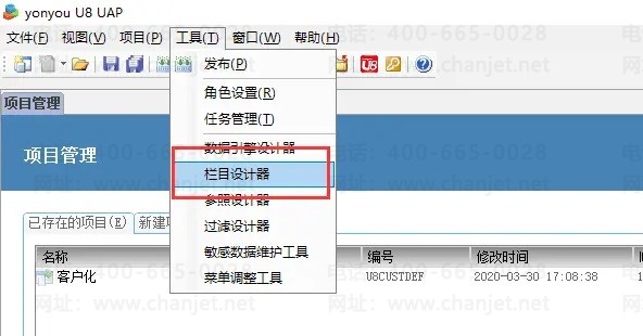 打开UAP,登陆对应账套,双击客户化。到工具-栏目设计器: