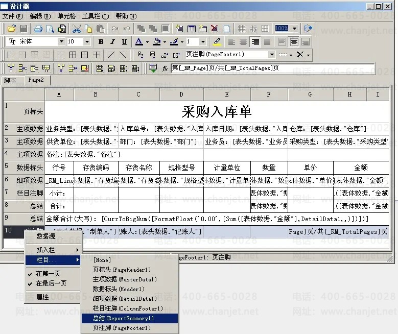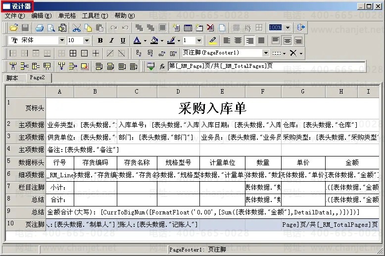 2、双击点开“demo”下的“采购入库单”。弹出“设计器”