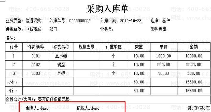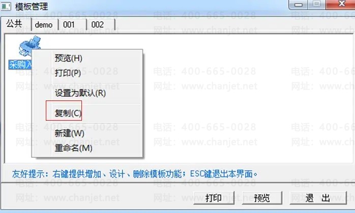 1、依次点击“采购入库单”—“打印”—“新模板”,进入“模板管理”界面后将“公共”下的打印样式复制到“demo”(当前操作员)下