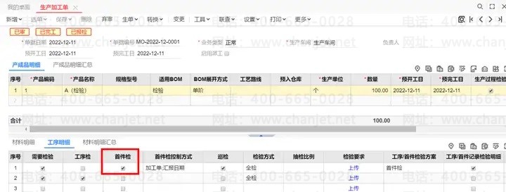 2.做一张生产加工单,工序勾选首件检,首件检控制方式可以选择,例如选择“汇报日期”,那不同汇报日期的工序汇报单都需要重新走首件检,首件检合格后,才可以做后续的工序汇报。