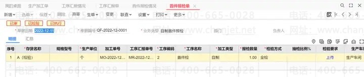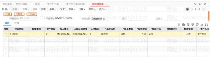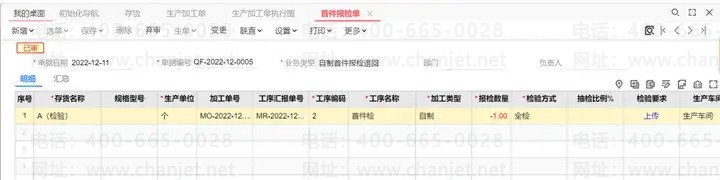 3.根据生产加工单生成工序汇报单,保存审核后,会自动生成一张首件报检单