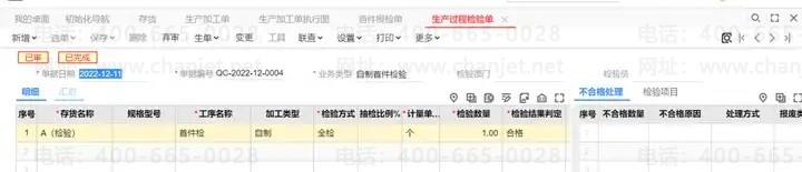 4.根据首件报检单生成生产过程检验单,检验结果判定需要选择“合格”还是“不合格”
