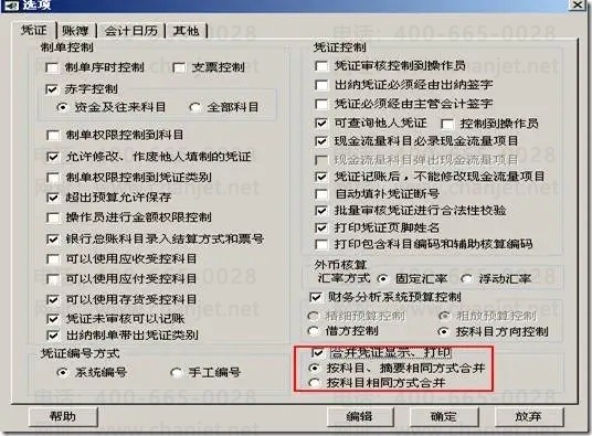 一、勾选此选项则表示在科目明细账中可以按照科目、摘要相同方式合并,或者按照科目相同方式合并。