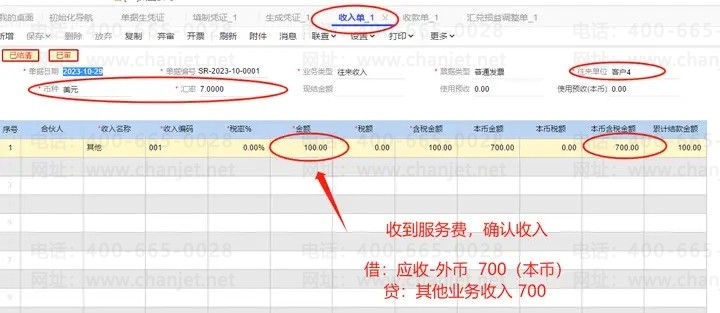 问题1:10月30号收到服务费100美元/当天汇率6.5元,要做【汇兑损益调整单】调差