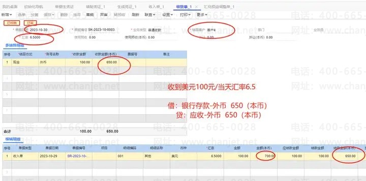 2、10月30号收到服务费100美元/当天汇率6.5元,填制【收款单】、【汇兑损益调整单】