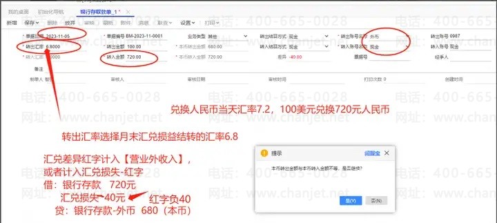 问题3:11月5号将美元兑换成人民币/当天汇率7.2元,要做【银行存取款单】调差