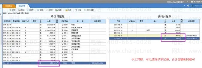 可以手工选择多条记录,合计金额相等就可以对账(期初对账单方向为借方,则两边方向需一致,否则相反)