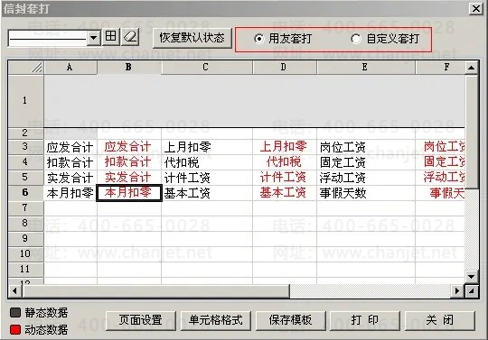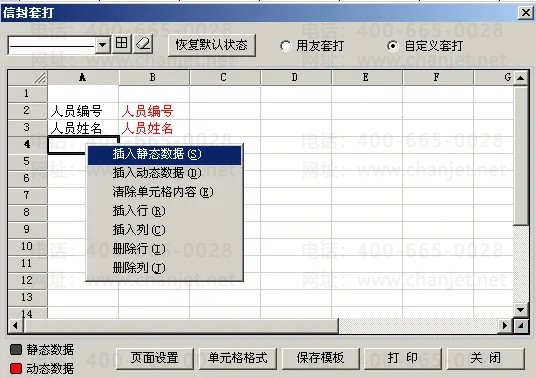 自定义套打格式,点中单元格,右键选择插入静态数据或插入动态数据