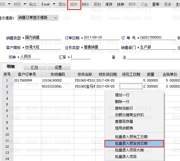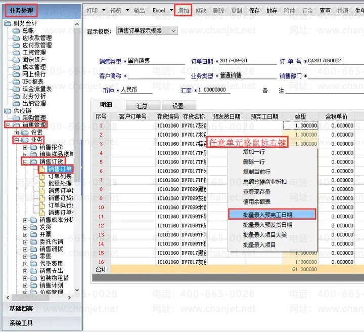 (1)【销售管理】-【业务】-【销售订单】-【增加】-选择【存货】后-任意一单元格鼠标右键-选择【批量录入预发货日期】