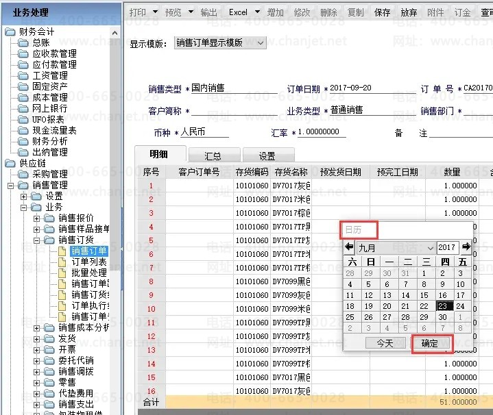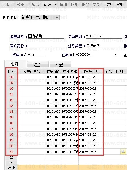 (3)销售订单上51行记录,预发货日期全部自动填充。