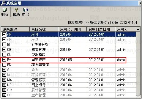 五、重新初始化后系统启用中固定资产模块置黑,勾销反启用即可。以后月份哪个月固定资产有业务就哪个月开始勾选启用。