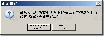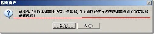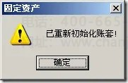 三、点击是后系统还会再次提醒确认,此时点击是系统即完成初始化操作并清空此账套固定资产模块的所有业务数据。